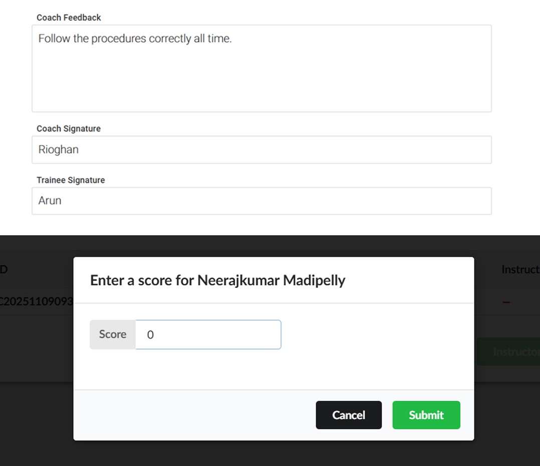 Trainee + trainer signatures captured in one step - instant compliance, no second submission.