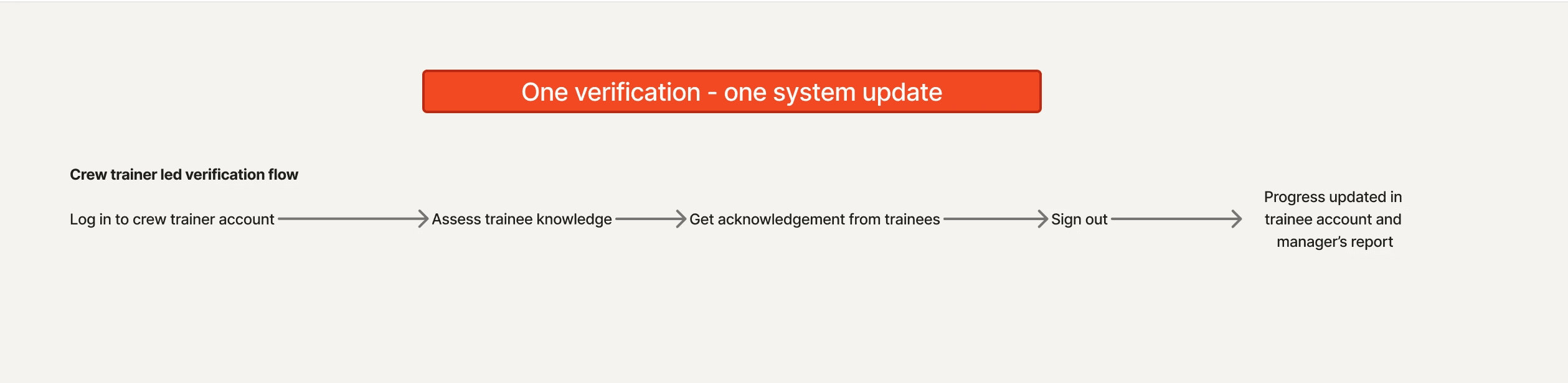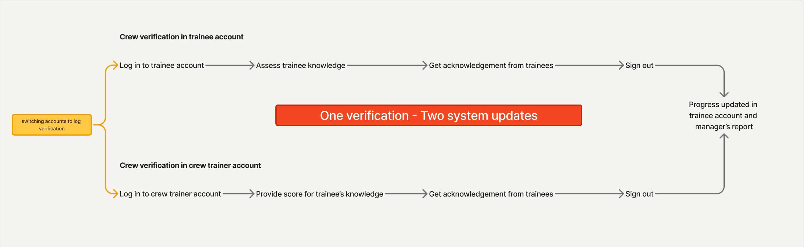 All verification now happens in the Crew Trainer account — eliminating role switching, duplicate entries, and cross-account updates.