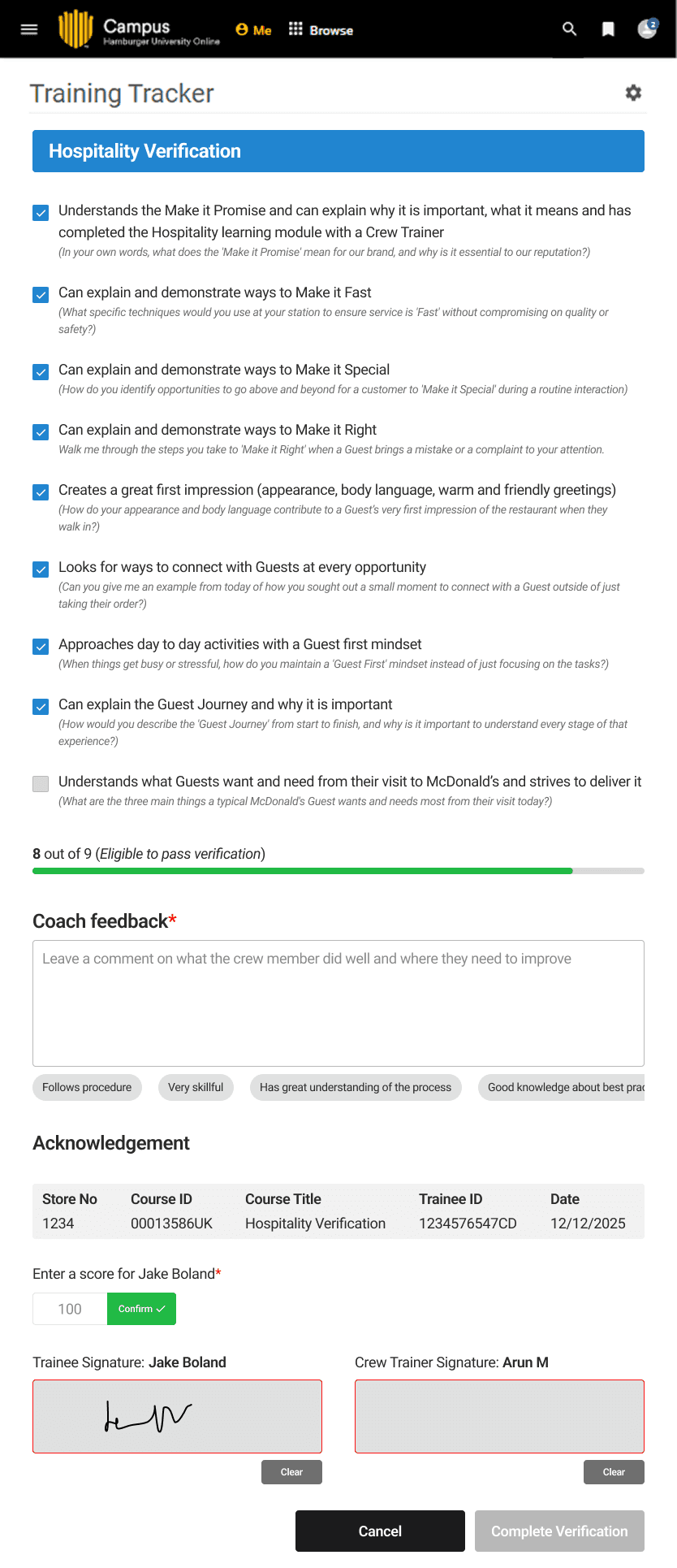 It takes around ~12 to ~15 min for a crew trainer to verify a trainee on a station and a crew trainer verify around 3-5 stations every session. This leads to crew trainer and trainee leaving the floor for hours, resulting in an understaffed floor.