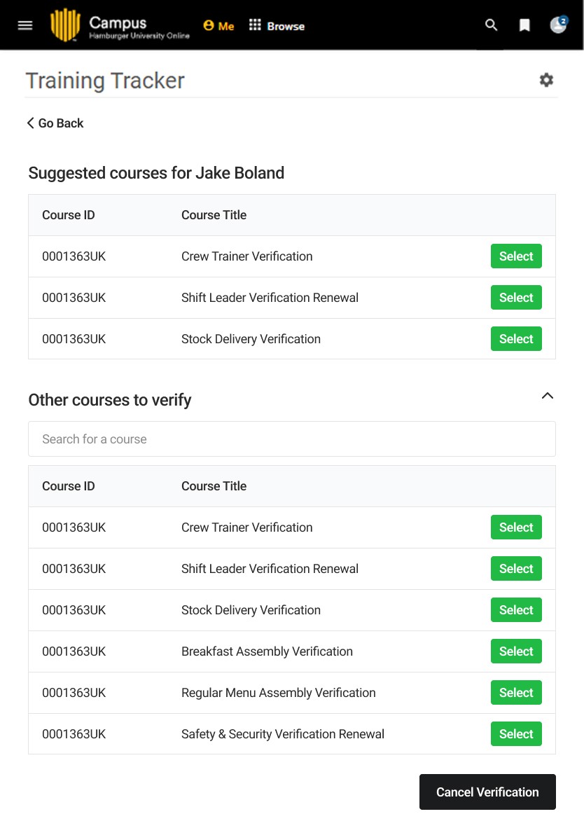 Course suggestion based on trainee history reduces manual searching for courses